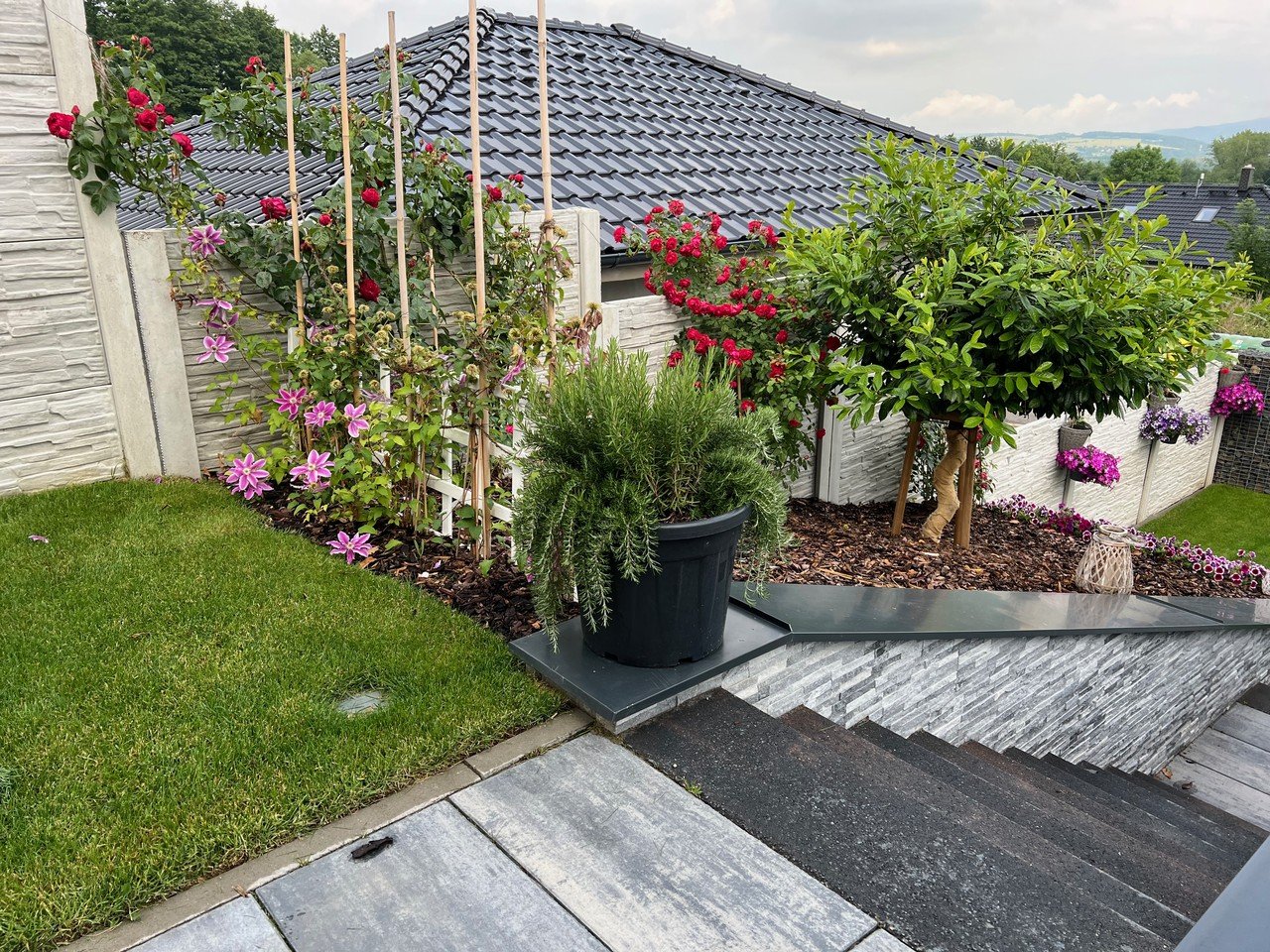 • zbytek terasy tvoří travní koberec s automatickým zavlažováním